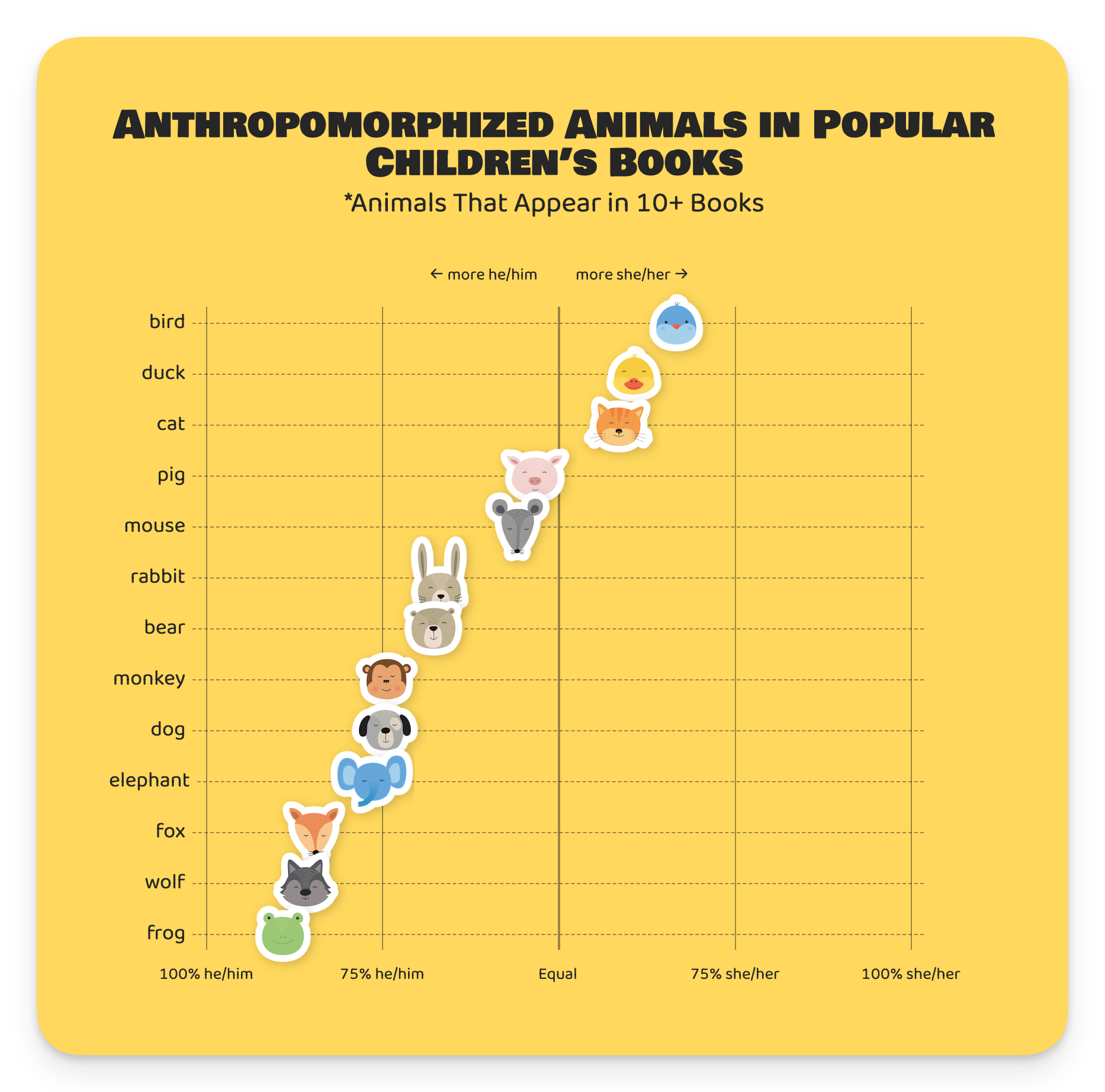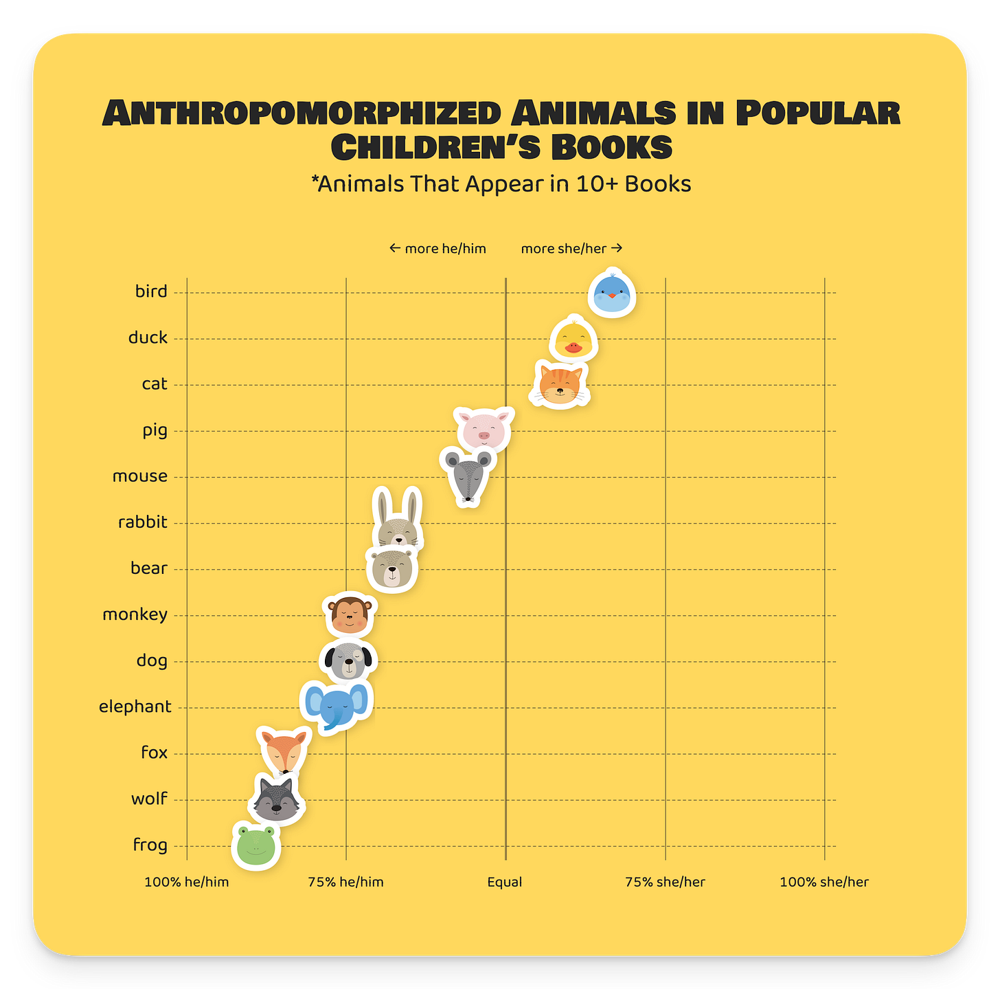 Where do these gendered presumptions even come from, and how pervasive are they? Is it common to assume that a frog is a “he?” What about a bear, or a bird, or a cat, or a pig?